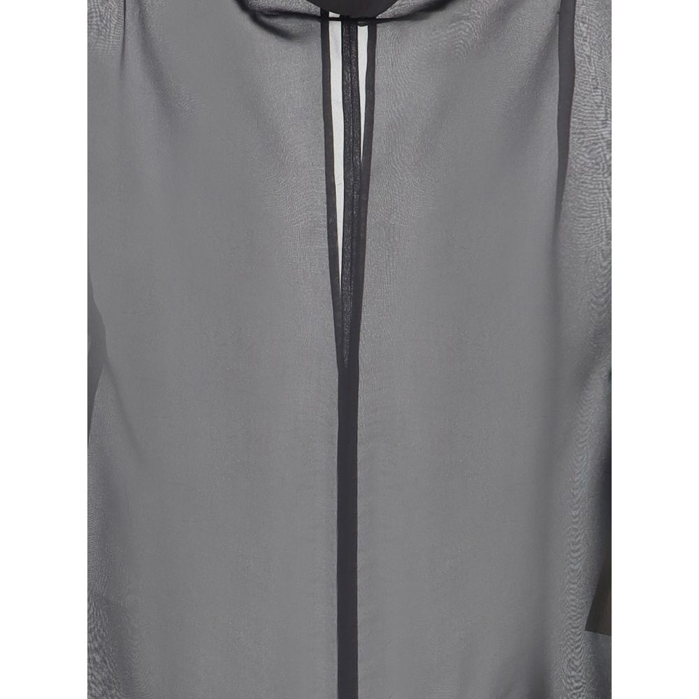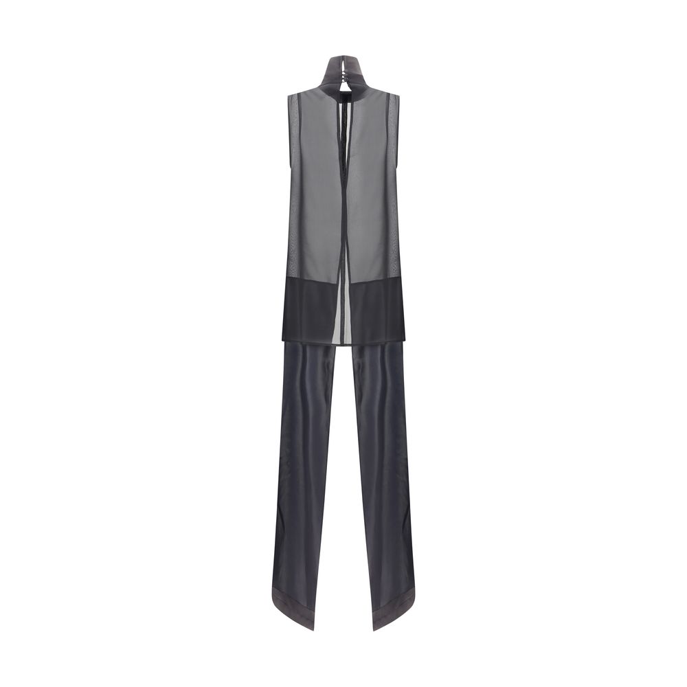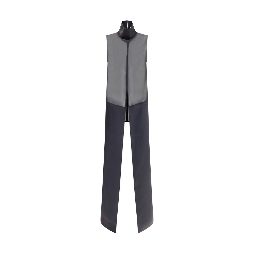 Di Stavnitser’s silk Aida Top is a sophisticated garment with a contemporary style. Sleeveless and high-necked, it is distinguished by a long front panel that falls to the feet, divided in the middle by a deep slit that creates elegant movement. The semi-sheer design adds a touch of lightness and sensuality, making it ideal for refined and original looks.